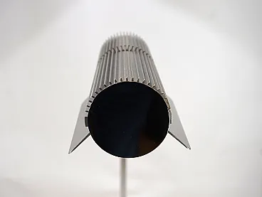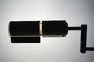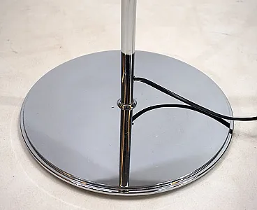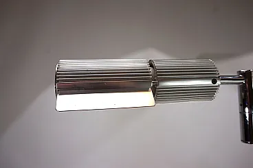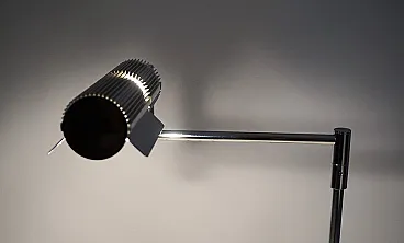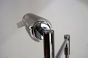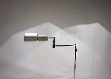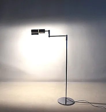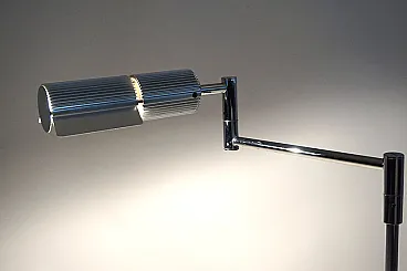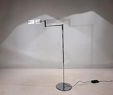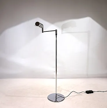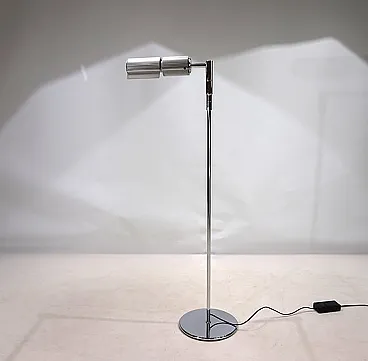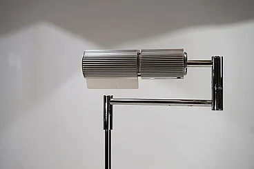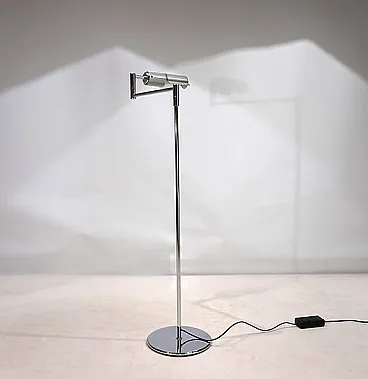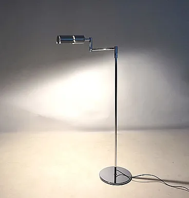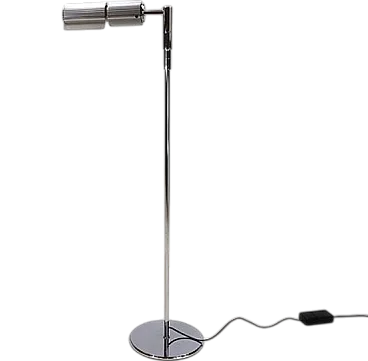 This classic floor lamp from the Zurich manufacturer Swisslamps is in very good condition. The lamp arm, which can be rotated 360 degrees, rests on a heavy chrome base that shows barely any signs of wear. The finely grooved lamp head at the end of a swivel arm can be rotated on its axis and allows the lamp to be used as a floor or reading lamp, as well as a ceiling light or wall washer. The lamp head is finished in a matte silver metal shade. The lamp is turned on via a foot switch with dimmer function.