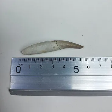 This is a 2.3" long, rooted tooth from a large, dinosaur-aged plesiosaur (Zarafasaura oceanis). It was collected from the phosphate deposits in the Oulad Abdoun Basin of Morocco.