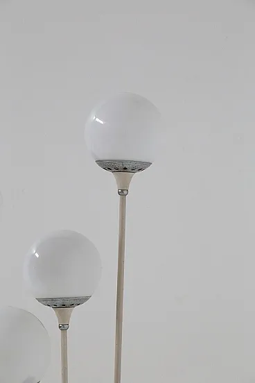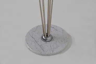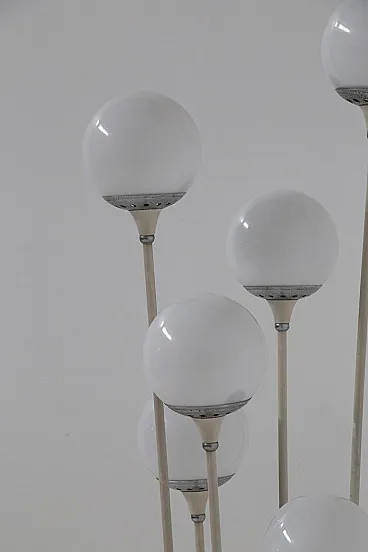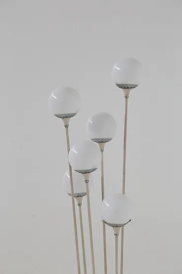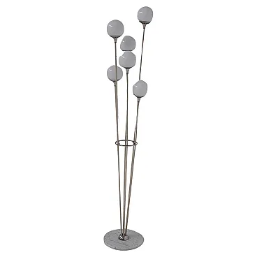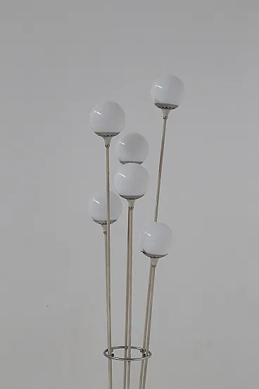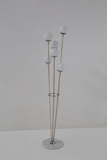 Stilnovo's Mod. Alberello floor lamp, dating from the 1950s, is a sublime example of mid-century Italian design. This lamp features a round base made of white marble, a material that lends stability and sophistication, evoking a sense of understated luxury. From the base grow six painted aluminum tubes, which rise to different heights, creating a visual dynamism reminiscent of the natural growth of a tree. These tubes serve as anchors for the spherical white glass lampshades, each of which houses a single light within it. In total, there are six lights.The lamp holders are equipped with metal joints that allow precise orientation of the light spheres, ensuring an even distribution of light. The name Alberello, meaning "little tree," comes precisely from the radial arrangement of the tubes, which recreate the organic shapes of a tree, giving the room a touch of nature reinterpreted through the elegance of modern design. Turning on the Alberello lamp creates warm and enveloping plays of light that transform the atmosphere of the room, making it intimate and welcoming. Every detail of the lamp, from the materials chosen to the balanced proportions, testifies to the meticulous attention and craftsmanship that made Stilnovo the undisputed leader in Italian design in the 1950s. The Alberello lamp is not just a piece of furniture, but a symbol of Italian design excellence, capable of enriching any modern setting or elegant living room with its timeless appeal. Perfect for those seeking an iconic piece that combines aesthetics and functionality, this lamp is destined to become the centerpiece of any space in which it is placed, evoking the beauty and craftsmanship of the golden age of Italian design.