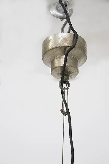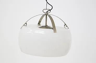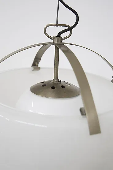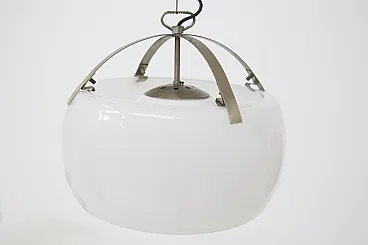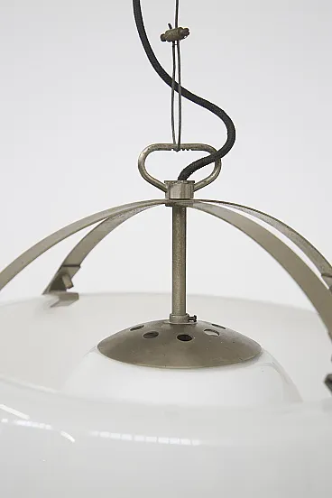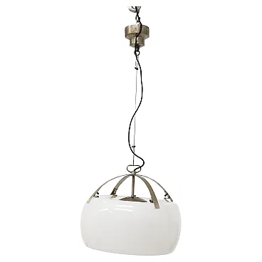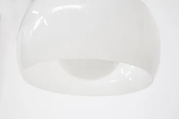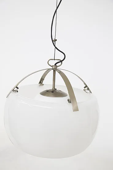 Imagine a luminous suspension lamp that immediately catches the eye with its grandeur and refinement: the Omega lamp, designed by the celebrated designer Vico Magistretti for Artemide in 1962, is an extraordinary example of avant-garde Italian design. This large lamp stands out for its elegance and the skill with which it was made. The structure is composed of two separate pieces of opaline glass, which are joined on a brushed metal frame, creating a perfect balance between visual lightness and solidity. The opal glass diffuses lightly and evenly, creating an enveloping and sophisticated atmosphere in whatever room it is installed. A particularly interesting detail of the Omega lamp is the ability to adjust its height as needed. This feature not only increases the versatility of the lamp, but also allows the lighting to be customized to perfectly match the desired space and mood. The lamp is equipped with an E27 lamp holder, which allows the use of different types of bulbs to achieve different lighting effects. Made with refined techniques such as metal brushing and glass working, the Omega lamp is a true masterpiece of industrial design. This design icon was immortalized in the pages of Artemide's 1972 catalog, where it appears illustrated on page 4, testifying to its value and importance in the international design scene. The Omega lamp is not simply a functional object, but a work of art that enriches any space with its scenic presence and timeless quality. It is a symbol of Vico Magistretti's creative genius and Italian craftsmanship, capable of transforming light into an aesthetic and emotional experience.