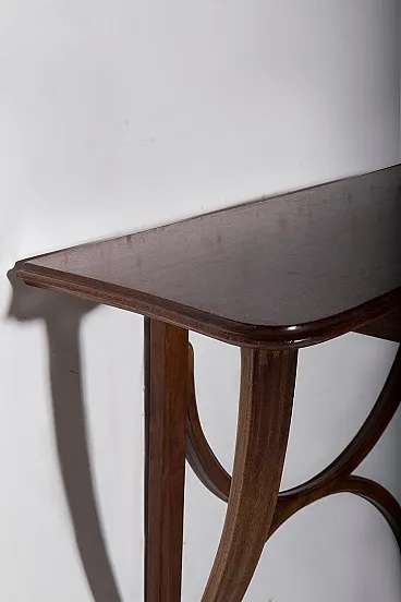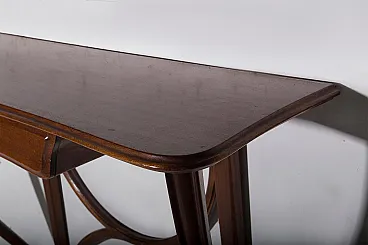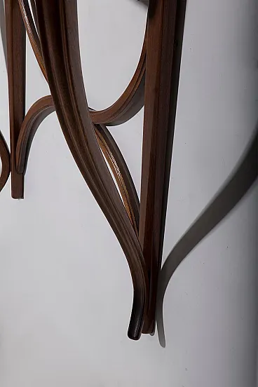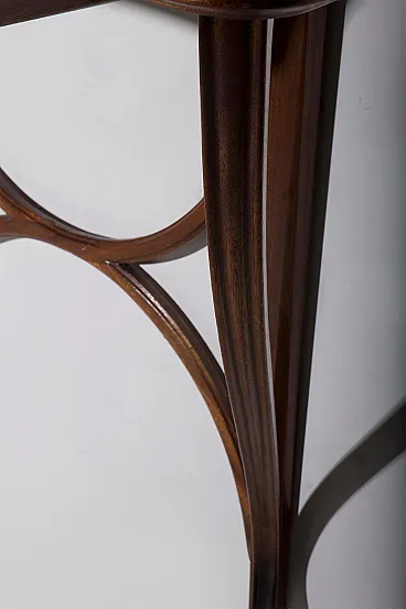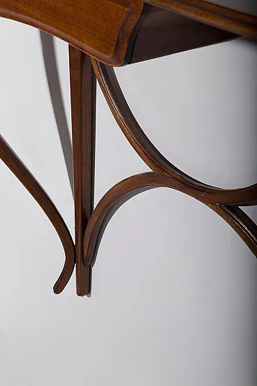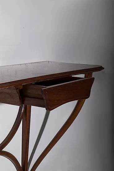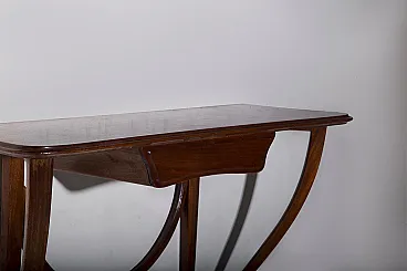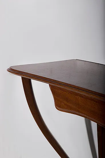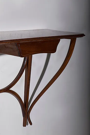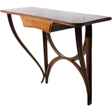 This extraordinary wall-mounted console, designed by the renowned Italian designer Ico Parisi in the 1950s, is a sublime example of the elegance and innovation that defined Italian design from that era. Crafted with impeccable workmanship for ArteCasa of Cantù, the console is a true masterpiece of balance between sinuous shapes and warm materials, characteristic of modernist aesthetics. The smooth wood, with its natural grain accentuated by a glossy finish, conveys a sense of warmth and intimacy. The soft curves of the legs intertwine in an organic design, almost as if they were roots merging with the wall, creating a sensation of suspended lightness. The surface of the console, thin and gently rounded at the edges, extends elegantly, inviting both contemplation and discreet use. Beneath it, a small drawer with a clean profile is almost hidden, like a secret kept within this work of art. The entire composition expresses perfect harmony between functionality and sculptural beauty, making this console not just a piece of furniture but a true statement of style. It reflects Parisi's craftsmanship and artistic vision, seamlessly blending tradition and innovation with unique sensitivity. Every line, every detail conveys a sense of fluidity and movement, while its suspended structure gives it a visual lightness that contrasts wonderfully with the solidity of the material. It is a piece that cannot go unnoticed, destined to evoke emotion and admiration in anyone who beholds it. Over the years, ArteCasa of Cantù has produced various versions of this "Console with Ramage," using different wood types and altering the dimensions, making each piece unique and adaptable to different spaces and style preferences.
