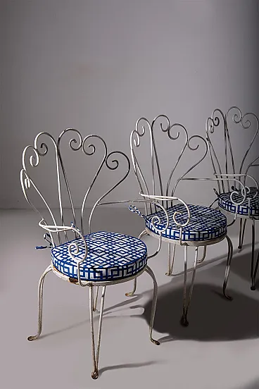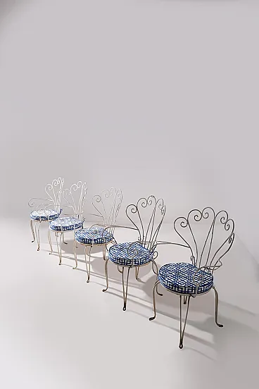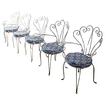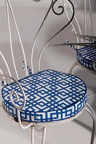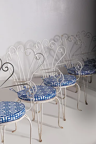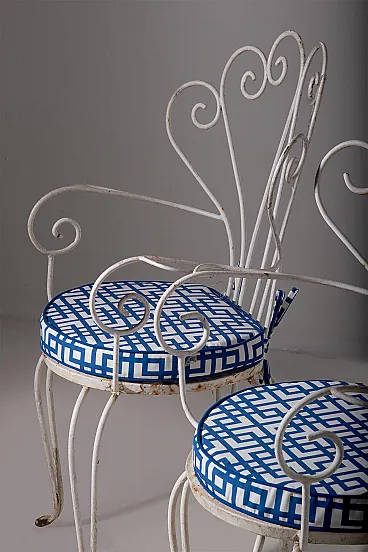 These garden chairs, produced by the renowned Italian manufacturer Casa e Giardino in the 1950s, are a magnificent example of the elegance and refinement that characterized outdoor furniture of that era. The finely crafted metal structure features soft, sinuous lines, with curled decorations that evoke a sense of lightness and romance. The slender legs and elaborate backrest give these chairs a timeless charm, making them perfect for creating a sophisticated outdoor space. The seats have been newly reupholstered with a blue and white geometric fabric, adding a modern touch to the classic design. The contrast between the freshness of the new upholstery and the patina of the original metal makes these chairs unique, telling a story of design and style that spans decades. The fabric was chosen to be weather-resistant while maintaining a refined and contemporary aesthetic. Perfect for decorating gardens, terraces, or patios, these garden chairs are not just decorative elements but represent a piece of Italian design history. Their timeless elegance makes them ideal for those seeking vintage furniture that is both comfortable and practical, with a modern touch thanks to the restored cushions.
