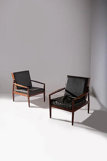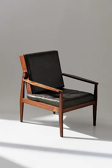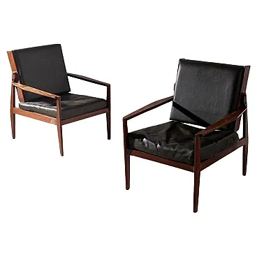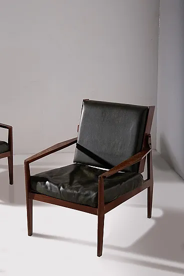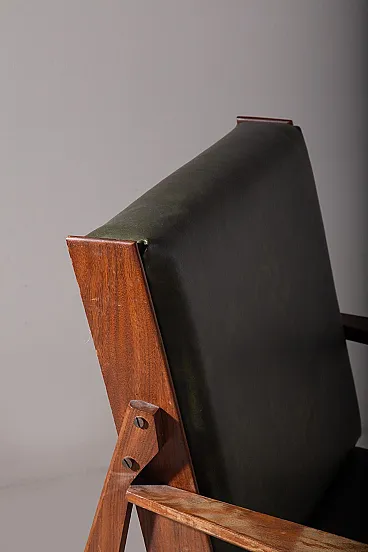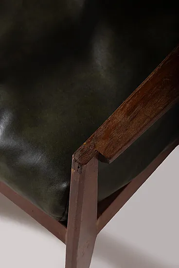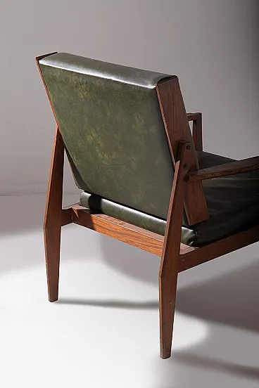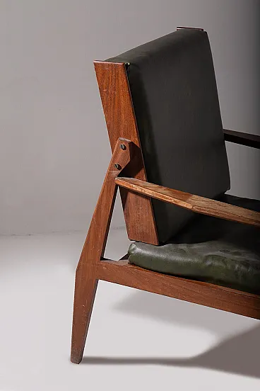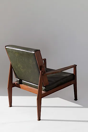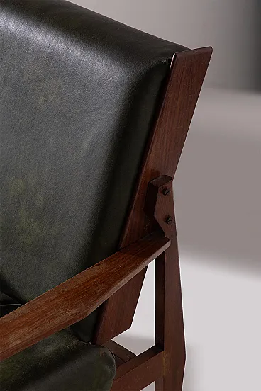This stunning pair of mid-century 1950s armchairs, crafted in Brazil, represents the perfect blend of elegance and functionality typical of this golden era of design. The wooden structure, with its clean lines and tapered legs, highlights the natural beauty of the material, while the dark green faux leather upholstery adds a touch of refined modernity. The contrast between the warmth of the wood and the deep hue of the upholstery creates a harmonious combination, making these armchairs a unique and captivating piece. Beyond their undeniable aesthetic value, they offer enveloping comfort with their wide seats and slightly reclined backs, designed for maximum relaxation. Perfect for vintage-inspired spaces or modern interiors seeking a retro touch, these armchairs are a timeless choice, bringing class and character to any room.