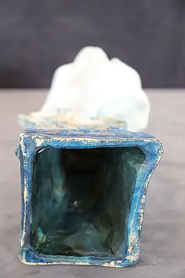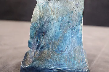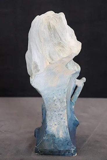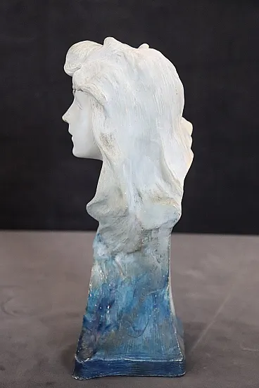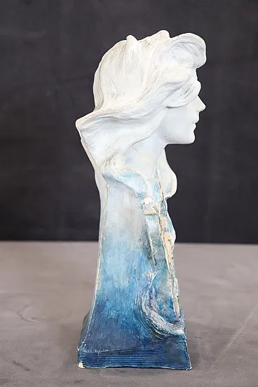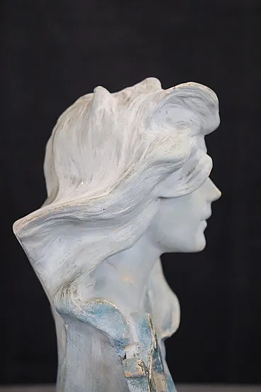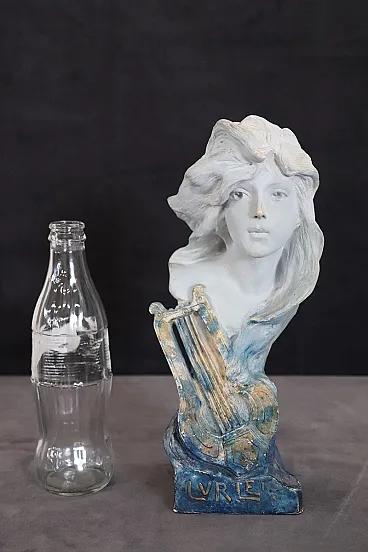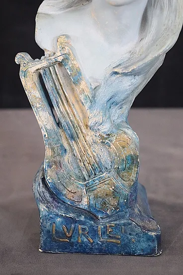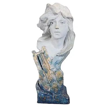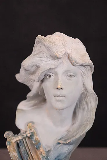 This terracotta sculpture is a fascinating work that captures attention thanks to its elegant depiction of a female figure. The details of the flowing, voluminous hair, along with the lyre, suggest a musical and artistic theme, evoking a sense of harmony and beauty. The delicate blue tones used in the work add a touch of serenity, making the work not only visually pleasing but also emotionally engaging.