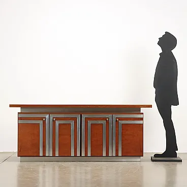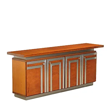 Cupboard with hinged doors in burl veneered wood and applied chromed aluminium strips.