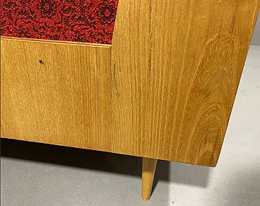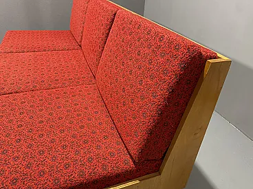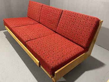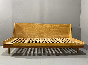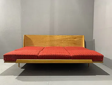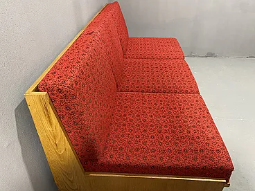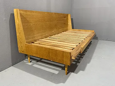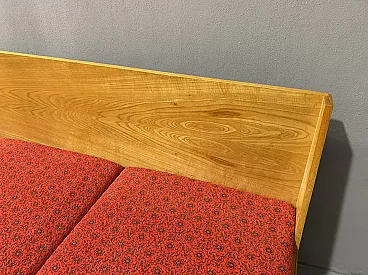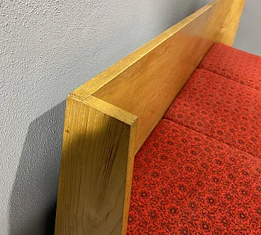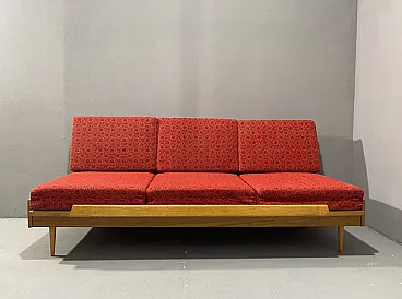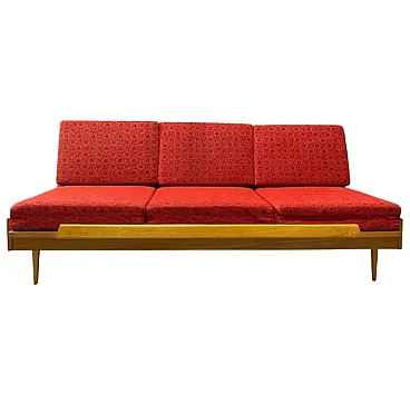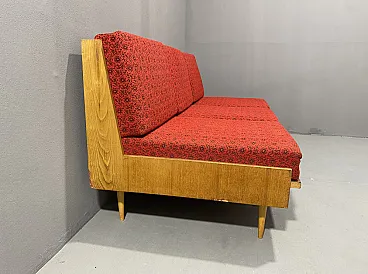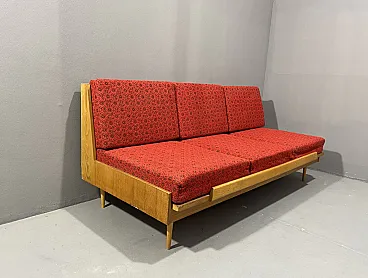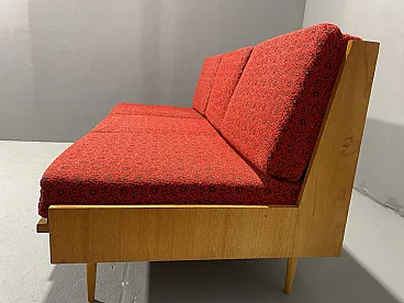 This mid-century sofa bed was made in the former Czechoslovakia in the 1970s. The sofa has a beech and plywood structure and an original covering. These sofas are currently very popular, both for their attractive appearance and their practicality. The sofa can easily be folded into a smaller double bed. The mattresses are on average soft and comfortable. The wooden parts and mattresses are in very good condition, with minor signs of age and wear.