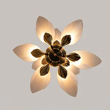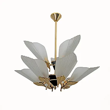 Rare nine-light chandelier marked F. Fabbian. Italy, 1980s. The structure is in brass and gold metal, while the lampshades are in acid-etched artistic glass in the shape of a petal. Rewired for Europe and the USA with E14 or E12 lamp holders