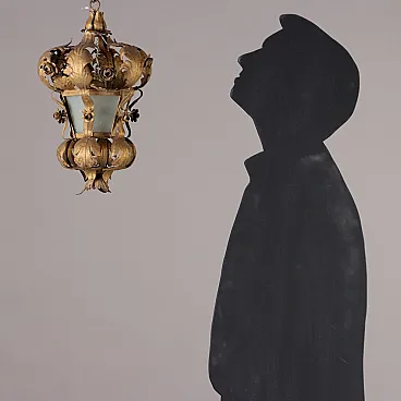 Small hexagonal lantern, iron structure enriched with leaves and flowers in gilded sheet metal. Frosted glass. Italy, late 19th century.