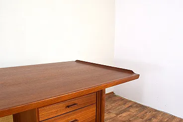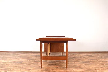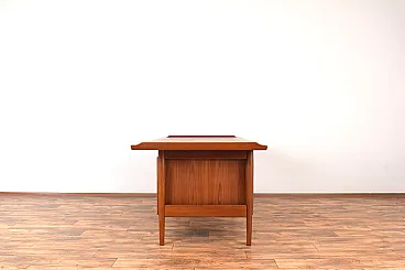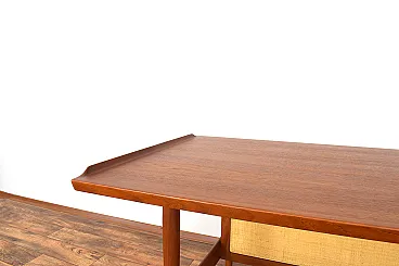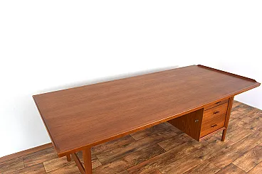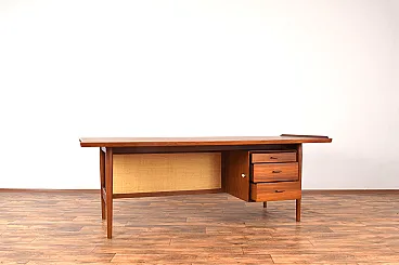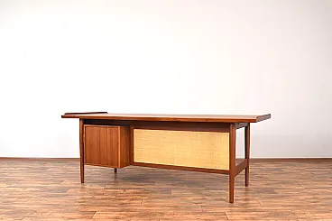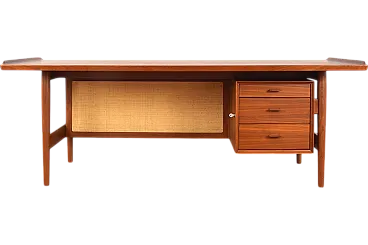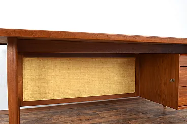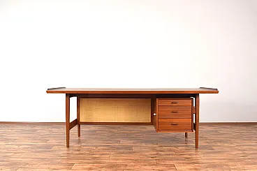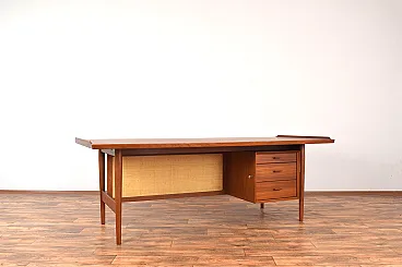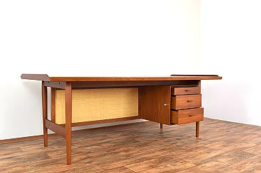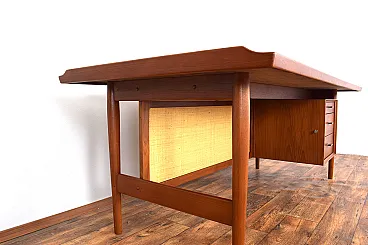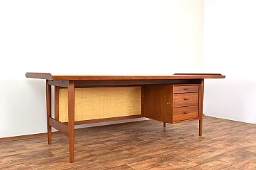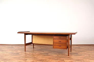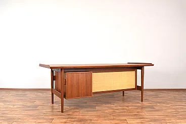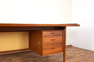 This desk was designed in the 1960s by Danish designer Arne Vodder and manufactured by Sibast. The furniture is made of teak wood and has been professionally and carefully restored by removing old coatings, staining and finishing with varnish. The desk is characterized by very high quality workmanship with attention to the smallest detail. The desk top is finished with a profiled edge. Three drawers are locked with a key, which is included with the desk. The back wall of the desk has been enriched with an insert made of cane.