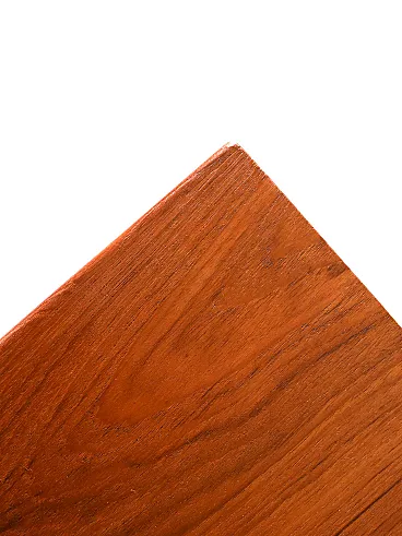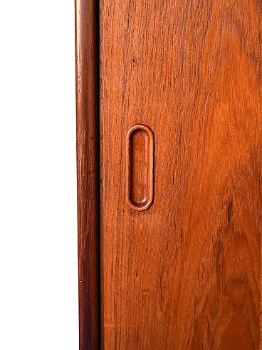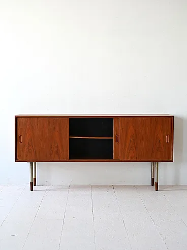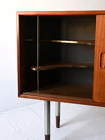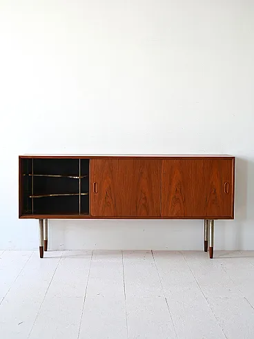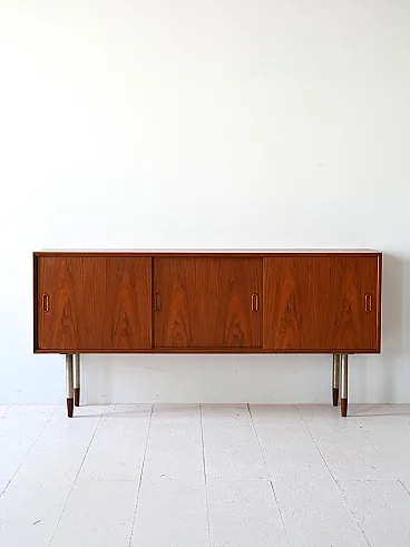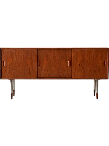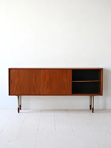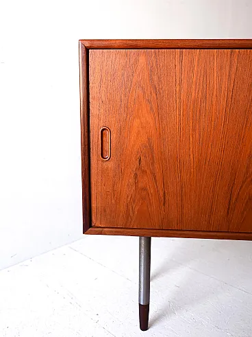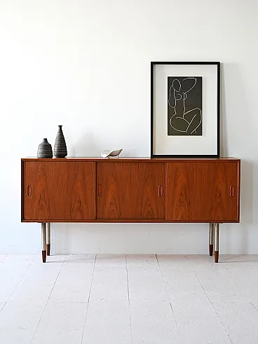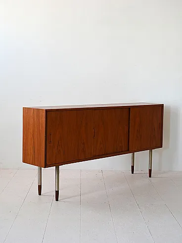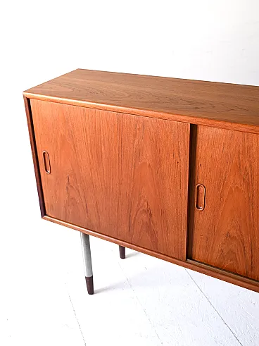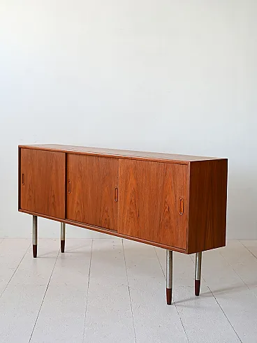 Sideboard of high quality Danish manufacturing with teak structure and sliding doors. The conical legs are made of metal with teak tips. One of the internal compartments has a mirrored back and two shaped shelves, ideal as a space for storing bottles of alcohol.