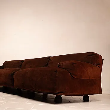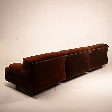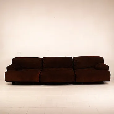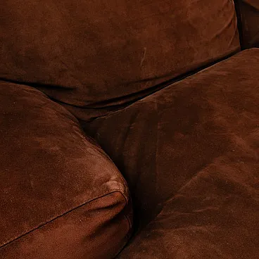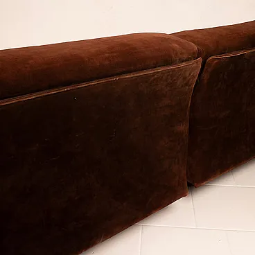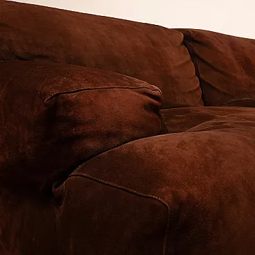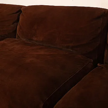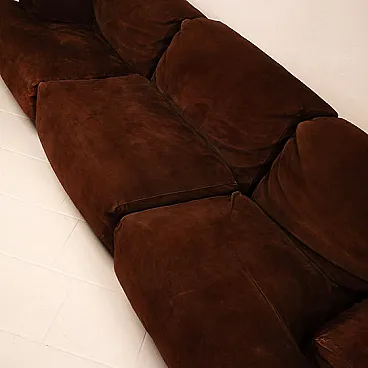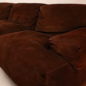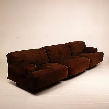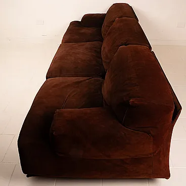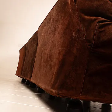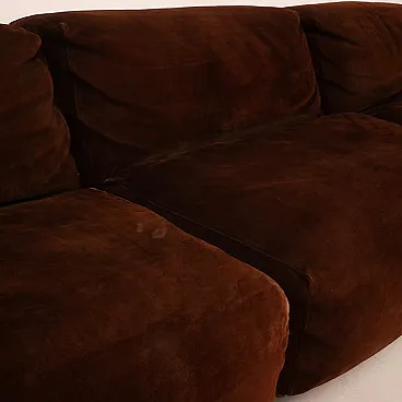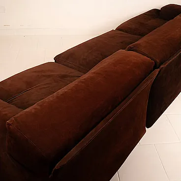 A wonderful "Flanders" sofa designed by Vico Magistretti and produced by Cassina in the 70s. The sofa presents itself in the extraordinary version lined with dark brown suede in excellent original conditions. "Fodra" is a project by Vico Magistretti put into production by Cassina in 1975, consisting of elements of session with simple lines and whose name evokes the "flat country", its solid trade and its precious fabrics, transferring the idea of solidity in the comfort of the sessions and preciousness in the variety of coatings that ranged from classic canvas to leather, wool and velvet. The sofa consists of modular elements and the coating of feather cushions, fixed by hinges, is removable. This design is characterized by its simplistic and round edges that can be seen in the form of the padding that underlines the clear structured design. In addition, this sofa was designed to offer maximum comfort thanks to the thick cushions and large sessions. The "Fodra" sofa by Vico Magistretti is a modular system that allows you to add elements, including the corners, to create the sofa of the dimensions you want.