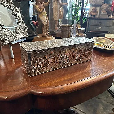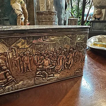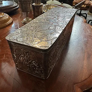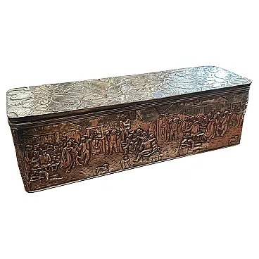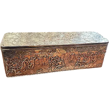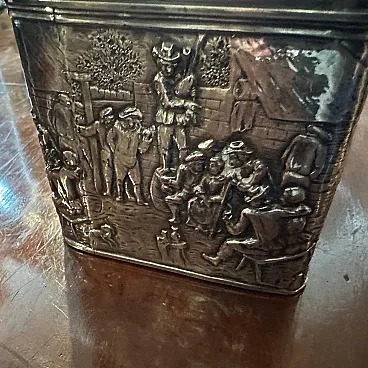 This 1900s Dutch Colonial Style Copper Silver Plated American Box by Barbour & Co. is a fascinating example of decorative art from the early 20th century. Made primarily of copper, which provides a warm, rich base material. Overlaid with silver plating, offering a lustrous, polished finish that contrasts with the copper tones if any wear reveals the base. Adorned with Dutch Colonial motifs, including depictions of pastoral scenes, windmills, sailing ships and florals. The embossing and engraving is intricate, showcasing the craftsmanship typical of Barbour & Co. pieces. Barbour Silver Company, based in Hartford, Connecticut, was known for its exquisite silver-plated items that combined artistic detail with practical use. Their Dutch Colonial Revival pieces were inspired by the resurgence of interest in 17th- and 18th-century Dutch craftsmanship, appealing to American buyers drawn to European nostalgia and elegance. This box in original condition would be an excellent addition to any collection of early 20th-century decorative arts, reflecting a blend of American ingenuity and European influence.