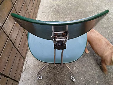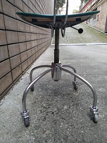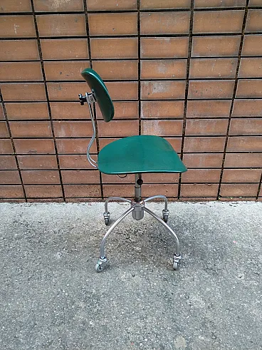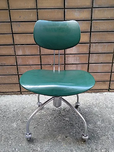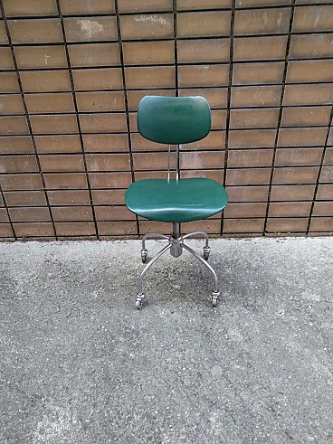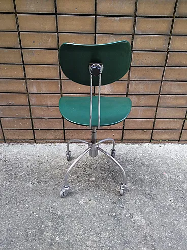 Office chair designed by Egon Eiermann and produced in Germany by Wilde & Spieth in the 1950s. The chair is made up of padded beech wood seat and covered in green skii with chromed metal structure. High session comfort thanks to the integrated suspensions. Adjustable sitting and back height. Montesacro area. Measures: H. SEAT 56-43 cm Max/min (back 92 cm max) - P. 40 cm - L. 46 cm