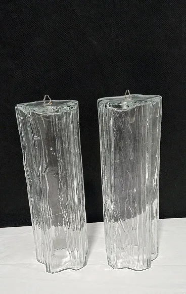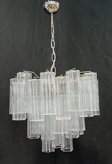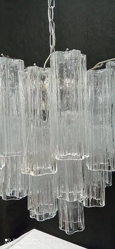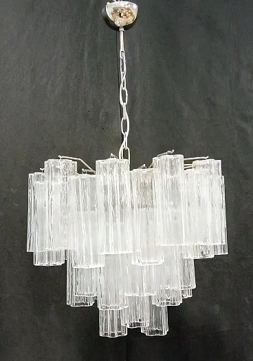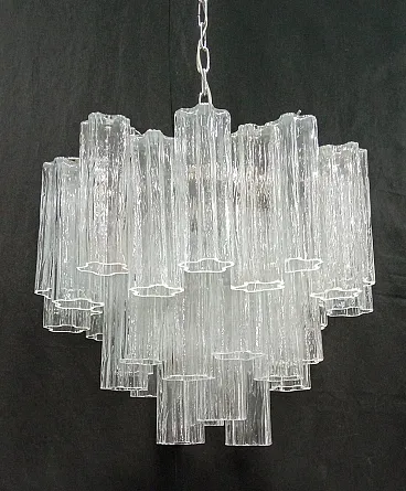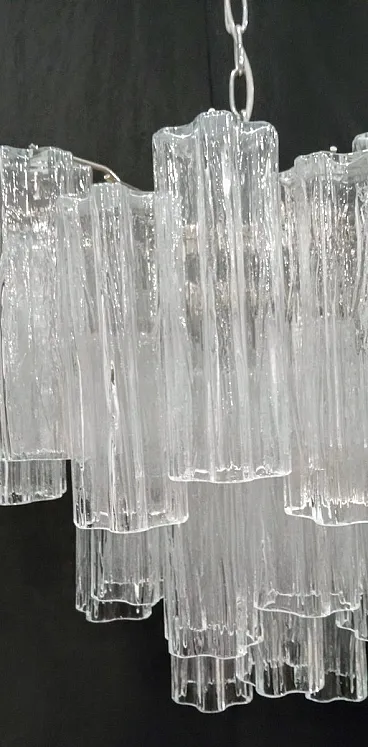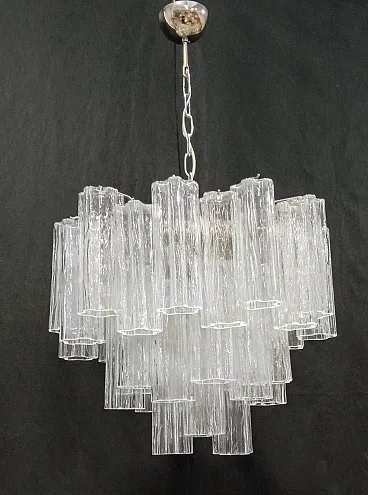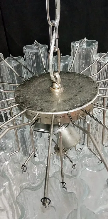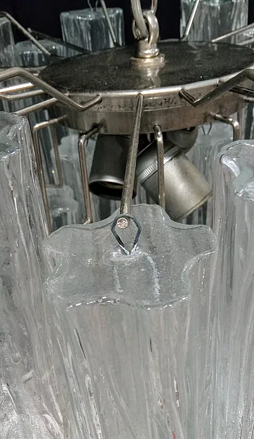 Chandelier with 36 star tubes in hand-blown Murano glass with "bark" finish. Structure in nickel-plated metal. Three original E27 lamp holders suitable for LED or filament bulbs. Electrical system checked and working.