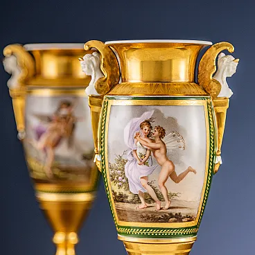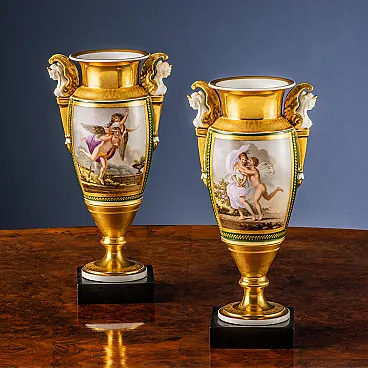 Pair of ceramic vases resting on a black Belgian marble base; with two handles in shape of winged caryatids. The vases are partially gilded and glazed in green with Empire-style motifs, such as Greek leaf motifs and subsequent leaf motifs. On the front, a painted polychrome reserve, in which Cupid and Psyche, Flora and Zephyr are represented respectively; on the back, on a green background, there is a wreath with vine leaves and a mask with feminine features.