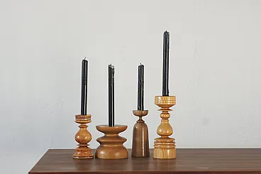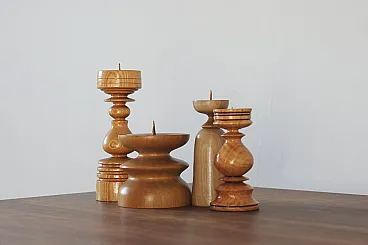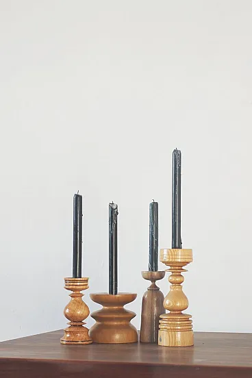 This set of Scandinavian wooden candle holders is a perfect example of the simplicity and natural beauty that characterize Scandinavian design. Made of wood, often from light species such as oak, beech or pine, these candlesticks exude warmth and coziness, fitting perfectly with the minimalist aesthetic of the North. Their form is usually simple and geometric, which makes them suitable for many interiors, both modern and more traditional. They are often designed to expose the natural structure of wood - the visible grain and texture add to their unique character. A distinctive feature of these candle holders is their ability to create a cozy atmosphere, especially when combined with warm candlelight. The wooden material blends perfectly with the rest of Scandinavian decor, where the focus is on simplicity, functionality and closeness to nature. Such a set can be a perfect accent on a table, dresser or shelf, bringing an atmosphere of peace and harmony to the interior. Scandinavian wooden candlesticks, thanks to their universal form, can be a subtle decoration, which at the same time has a practical function. Preserved in original condition. The height of the candlesticks varies from 20 cm to 14 cm - the diameter of the base about 6 cm - 11 cm.