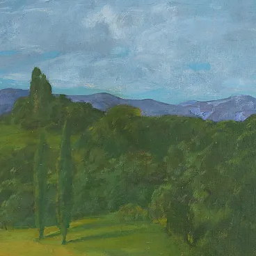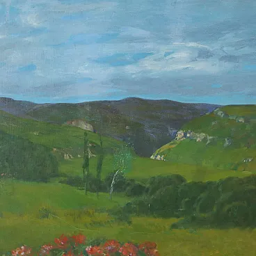 Oil on canvas. Signed lower right. In the large painting, a young woman with a halo is encircling the neck of a lamb with a wreath of flowers; the two figures are placed in a meadow full of flowering bushes, part of a verdant plain that extends to the mountain peaks in the distance. The girl, completely dressed in red, wears a halo on her head: this symbol and the presence of the lamb refer to Saint Agnes, traditionally depicted with this animal symbol of purity; the red of her dress may indicate the martyrdom of the young girl. It is the landscape setting that makes the depiction of the saint particular and unusual, who becomes the central element of the large landscape. Giovanni Buffa, a painter, sculptor and decorator active in Milan, became famous above all for his historiated stained glass windows, created alone or in collaboration with the famous company Beltrami & C. – Artistic stained glass, an almost absolute protagonist of the very brief season of national Liberty in this sector, specialized in the execution of stained glass windows of both a sacred and profane nature. Buffa contributed in particular with the creation of preparatory cartoons for many stained glass windows of the Milan Cathedral and other national churches. His pictorial production includes several portraits of people, especially Milanese, but also some genre scenes in exteriors, in cities or in naturalistic settings.