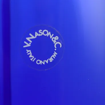Blue and white glass vase, V. Nason & C. manufacture. Adhesive label from the manufacturer and signature at the bottom.