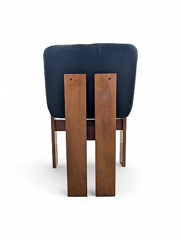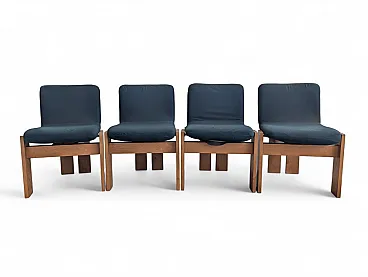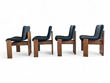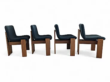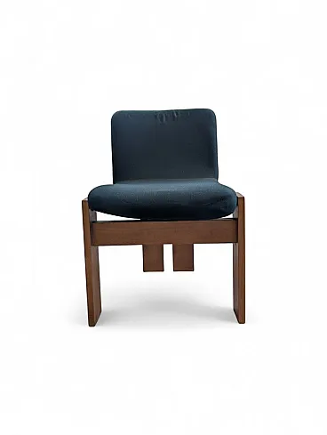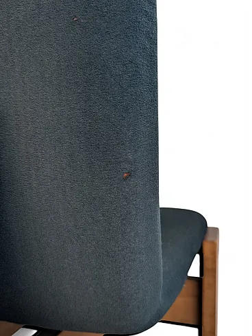 These dining chairs of Italian origin bear a strong resemblance to the "Pamplona" chair by Augusto Savini (1965) and the "Pigreco" chair by Afra & Tobia Scarpa (1959-1960), but this design is different in its details. The strong vertical and horizontal lines create a strong architectural expression. The backrest of the seat is supported by a wooden frame made up of two wooden slats arranged in parallel, which is further connected to the front legs. An additional slat is adjusted between the front and rear legs to stabilize the structure, but also to add another strong line. Black fabric is used to cover the entire seat, which matches perfectly with the beech wood. The conditions are excellent, the covering may have defects due to age and use. We recommend covering the 4 chairs! dimensions 75 x 52 x 40 cm (height, width, depth) seat height 43 cm