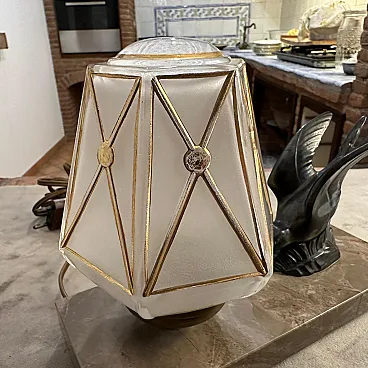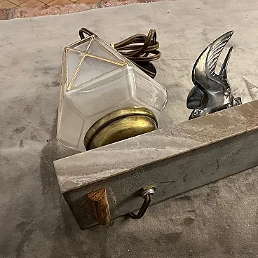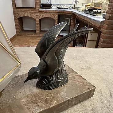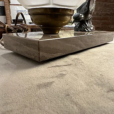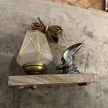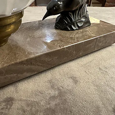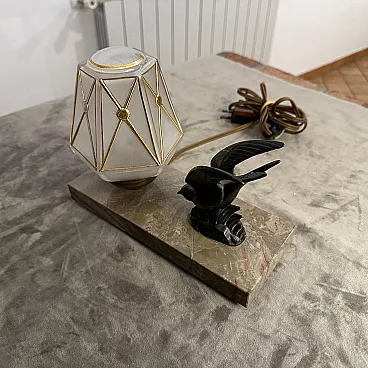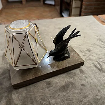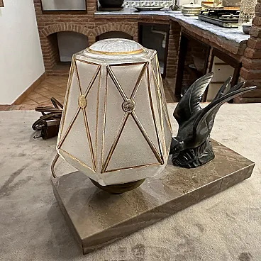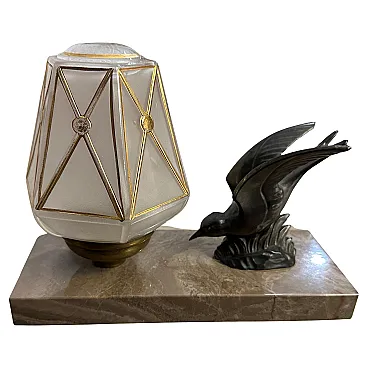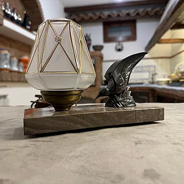 This 1930s Art Deco Table Lamp, crafted in France, combining marble, metal, and art glass to create an exquisite decorative and functional piece. The base is made of polished marble, showcasing natural veining and a rich, earthy tone characteristic of high-quality stone. It provides a sturdy and elegant foundation. A cast metal bird figure is mounted on the marble base, designed with intricate details that capture the motion and grace of a bird in flight. The metal have a dark patina, emphasizing its vintage appeal. The lampshade is made of frosted art glass, shaped into a geometric form, it features gold-painted geometric lines, adding a touch of opulence and highlighting the angular, modernist motifs of the era. The frosted finish softly diffuses light, creating a warm and ambient glow. The lamp is functional and designed for tabletop use, suitable for living rooms, bedrooms, or desks where a vintage aesthetic is desired. As a French-made piece from the 1930s, it holds significant historical and decorative value. The intricate craftsmanship and harmonious use of materials make it a sought-after item for collectors of Art Deco furnishings and enthusiasts of vintage lighting. This table lamp is not just a functional light source but also a work of art, blending natural and industrial elements in a design that remains timeless and elegant. It's in working order and in good condition overall.