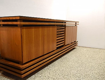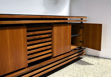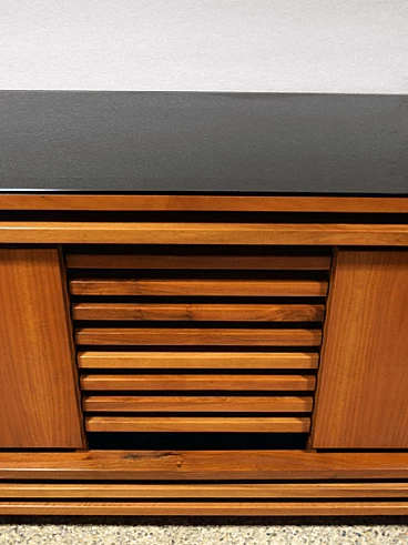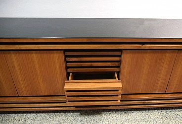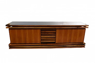 Sideboard in solid walnut wood with black crystal top, unique piece designed in the 1970’s. Central drawer and two compartments with door and glass shelf inside. In excellent conditions.