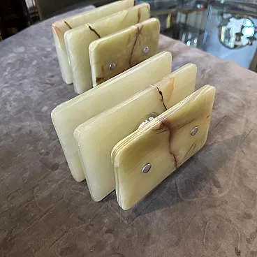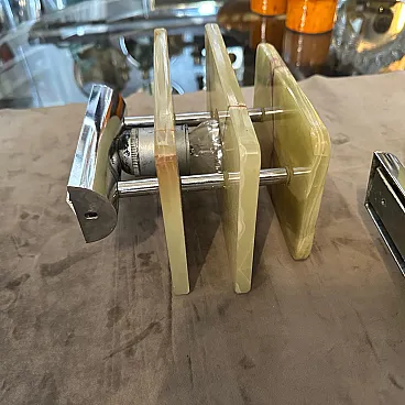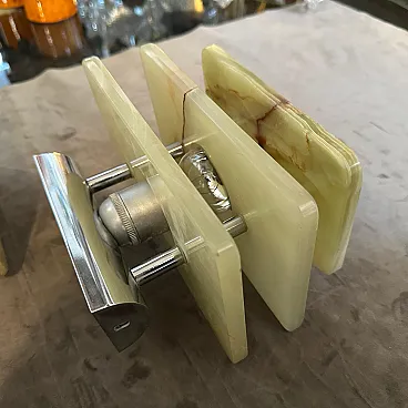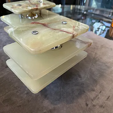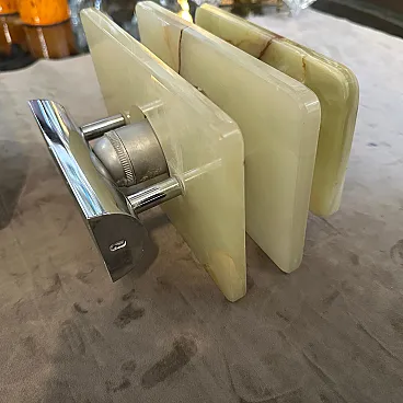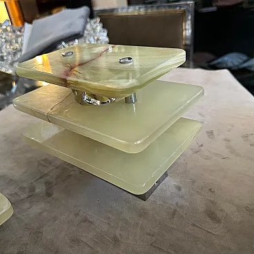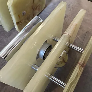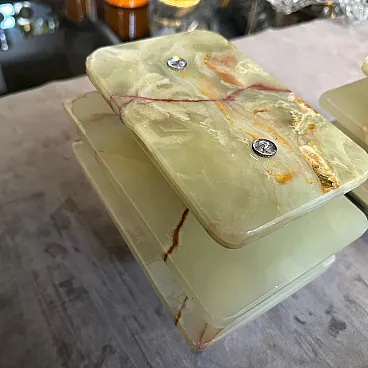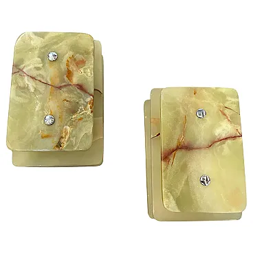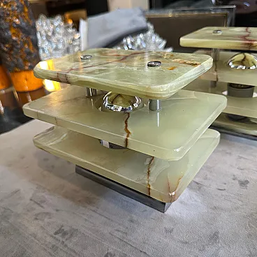 These 1970s Space Age green and brown onyx marble rectangular Italian wall sconces are elegant examples of mid-century modern design with a unique Space Age twist. Each sconce features a series of stacked, rectangular onyx marble panels, showcasing the natural, earthy tones and intricate veining of the stone. The panels are arranged in a way that creates depth and texture, adding visual interest to the sconces. The onyx marble has a rich, green color and warm brown color with varying shades and patterns, which are unique to each piece. The sconces are mounted on a steel base that complements the natural beauty of the onyx. The lighting element is discreetly housed within the marble panels, allowing the light to softly diffuse through the stone, creating a warm and ambient glow. The overall design of these wall sconces reflects the Space Age aesthetic of the 1970s, characterized by futuristic shapes and materials. The combination of luxurious onyx marble with the sleek metal accents makes these sconces a stylish and sophisticated addition to any interior.