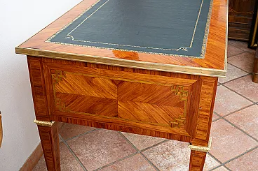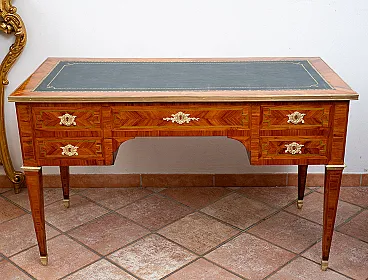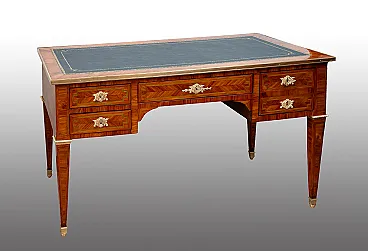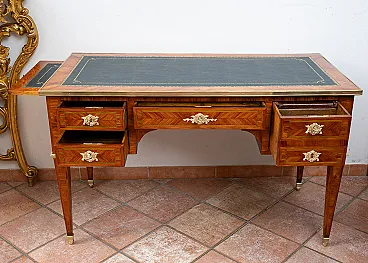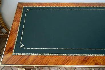 Description: Antique French desk in precious exotic wood with finely chiseled golden bronze application.