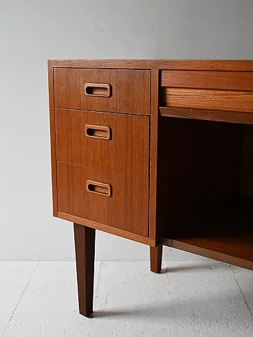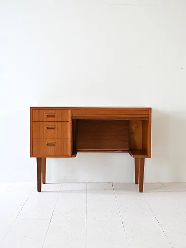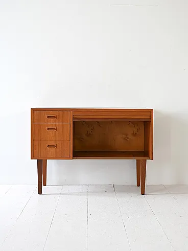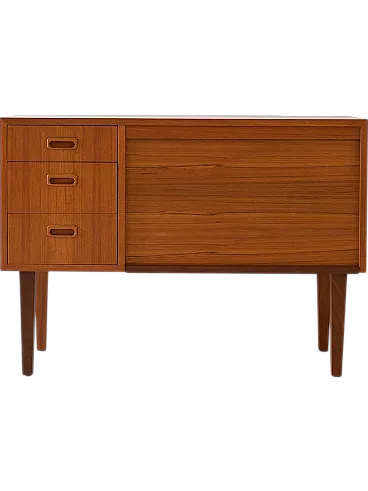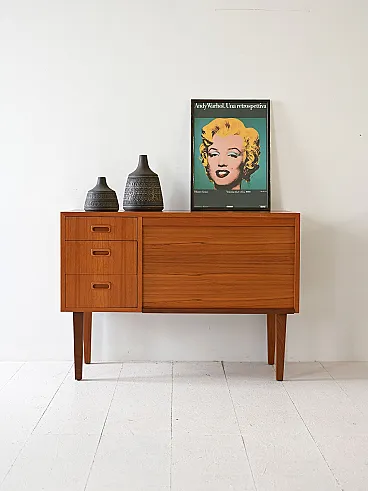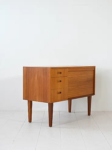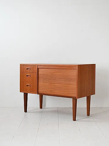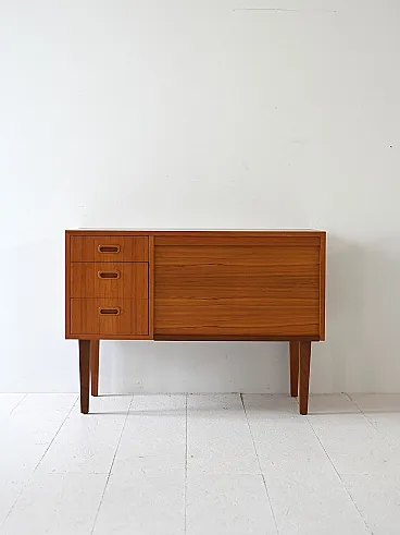 Scandinavian modernist mobile with three drawers and container compartment with door to Serranda which transforms it into a small desk. The teak structure, linear design and refined details make it a sideboard suitable for different styles and environments. Good condition. It may present signs of time. Pleasure pay attention to the photographs.
