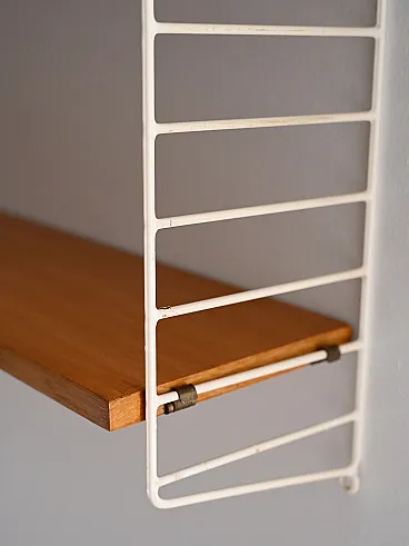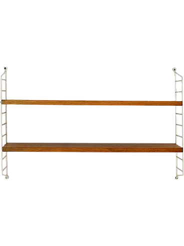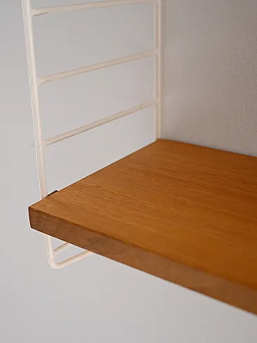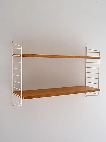 Scandinavian wall shelving system consisting of 2 oak shelves in oak and lateral structure in white coated metal. Perfect for displaying books and decorative objects. In good condition. It can present signs of wear due to time. Please pay attention to the photographs.