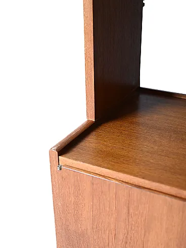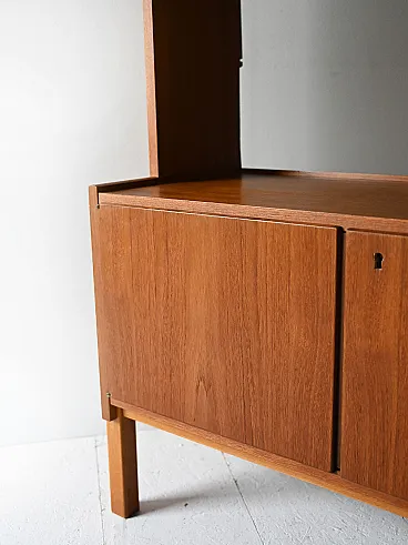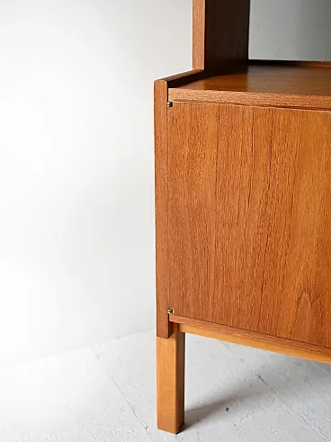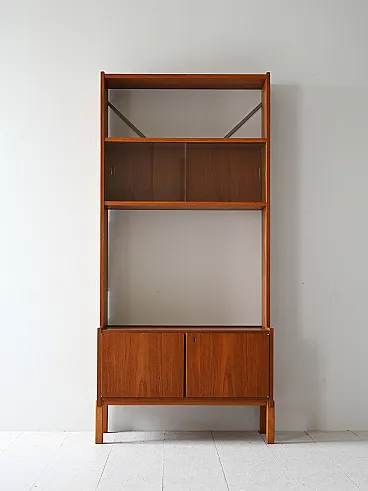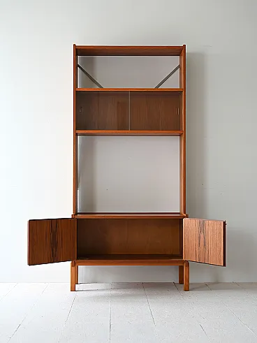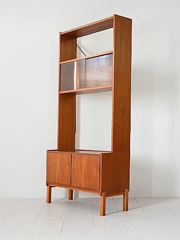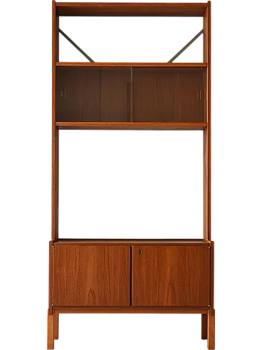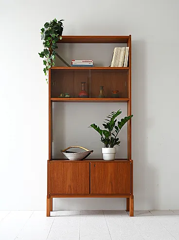 Teak bookcase furniture, vintage design. Equipped with open shelves and a lower compartment closed with doors.