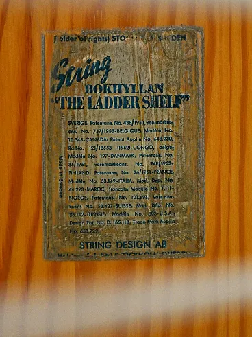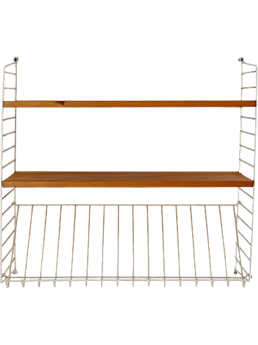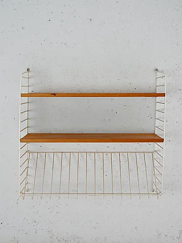 Scandinavian wall shelving system consisting of 2 mahogany wood shelves and white coated metal support structure. The metal structure, in addition to acting as a support, constitutes an additional inclined shelf, perfect for displaying catalogs or magazines. Good condition. It may present signs of time. Pleasure pay attention to the photographs.