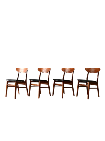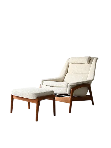 Pair of Scandinavian armchairs with red lacquered wooden structure and cream -colored fabric seat. There is also a coordinated footrest. Original and modern are perfect for characterizing an environment with a touch of vintage color and flavor. Good condition. It may present signs of time. Pleasure pay attention to the photographs.