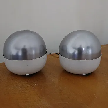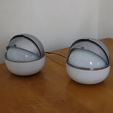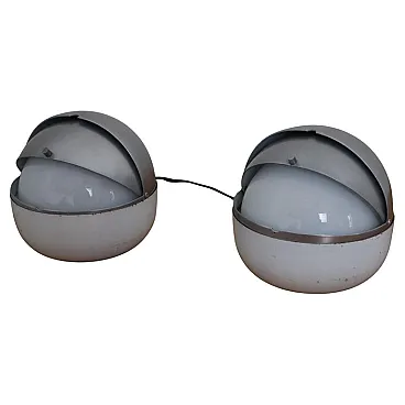 Pair of Space Age lamps of Lamperti, Italy, late 60s Iconic lamps produced by Lamperti in the late 1960s, in conjunction with the beginning of the Space Age era, characterized by futuristic design inspired by space exploration. The lamps have a metal structure and an opal glass diffuser, which guarantees a soft and diffused light. Their distinctive form recalls the helmets of the astronauts used during the landing on the moon, perfectly evoking the aesthetic and the innovative spirit of that period. This model is published in the Lamperti catalog of the time (Annex). Dimensions (cm): Width: 15 Depth: 15 Height: 15 A rare and fascinating piece of design, perfect for collectors and fans of the Space Age style.