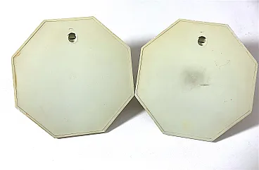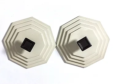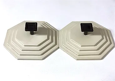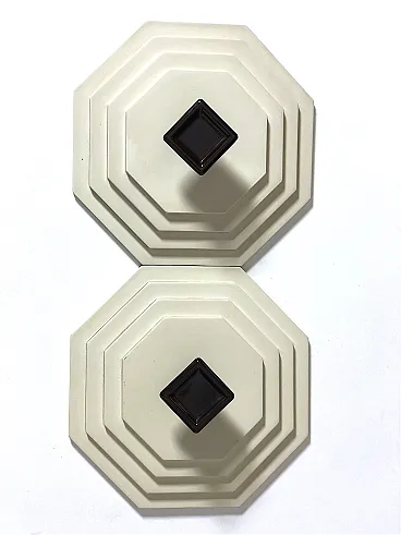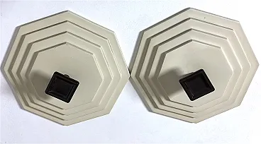 Beautiful set of beige hangers of the 70s, with a geometric and futuristic design inspired by the Style Spage Age. Ottonal in shape on several levels with a three -dimensional effect, accentuated by the contrast between the colors and the squaded knob. These hangers represent an icon of the 70s design pop, made of rigid ABS plastic, perfect for adding a retro and original touch. Perfect condition measures: width and height 27.5 cm- depth 9 cm 9 cm