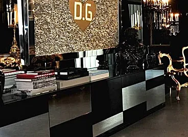Dolce & Gabbana style belief, in glossy black lacquered wood plywood and with decorative mirrors, 2000s.