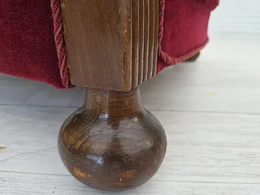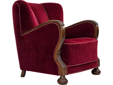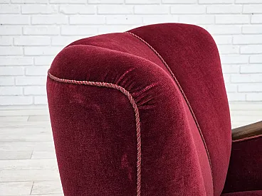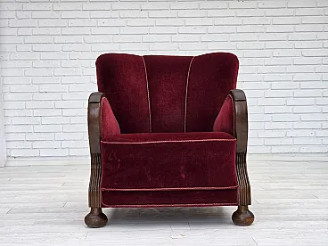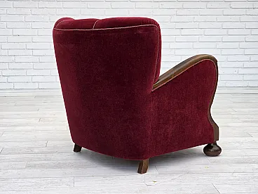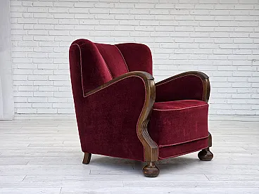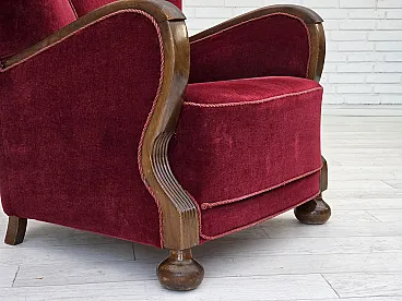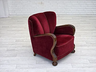 Danish relax armchair, cherry-red velour, dark beech, 1950s