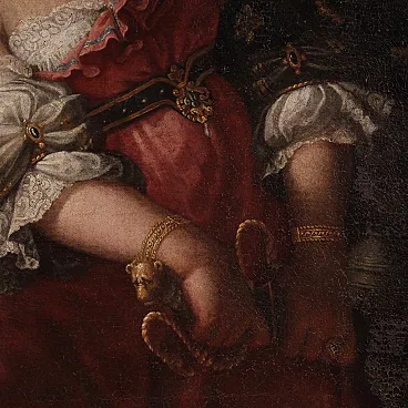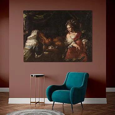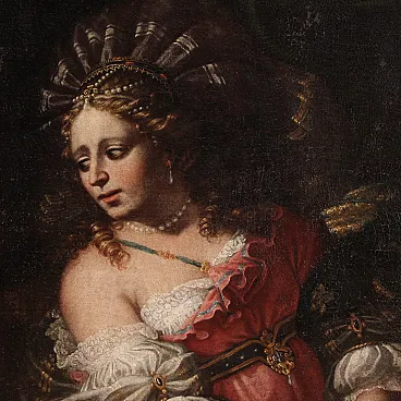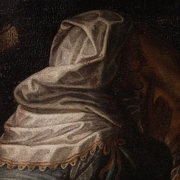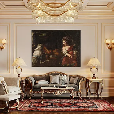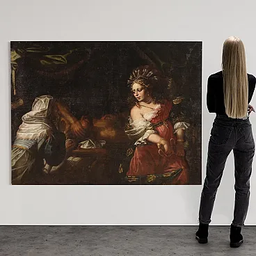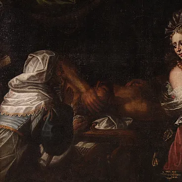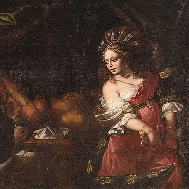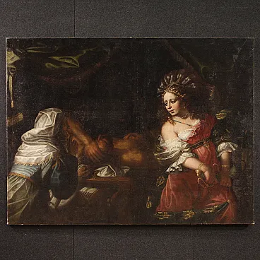 Wonderful Italian picture of the first half of the eighteenth century. Oil work on canvas depicting a biblical story of great charm, the beheading of the Babylonian leader Oloferne by the Jewish Jewish widow, who wanted to save their people from foreign domination. The scene assists the old servant Abra and everything takes place in the oxen while the light illuminates the protagonist of the composition and makes its jewels shine and the sword Elsa. Lombard school painting of considerable pictorial quality, in particular, the incredible realism of the sumptuous guides of Giuditta, with meticulous gold details, inserts and white lace with refined transparencies, should be underlined. The hairstyle is then superlative, the blond curly hair are adorned with an elaborate headdress, decorated with splendid pearls and feathers. Picture already restored with Rintelo, replacement of the frame and recovery of color in small points. Overall operates in good conservative state.