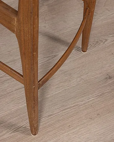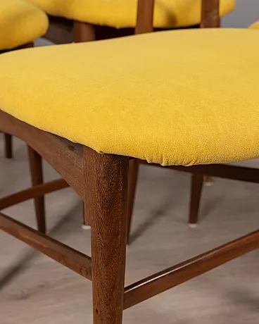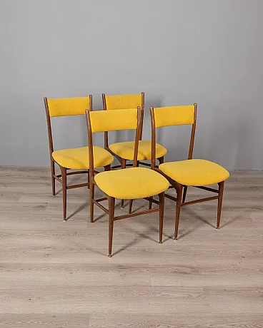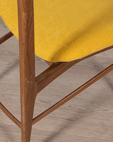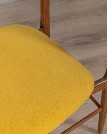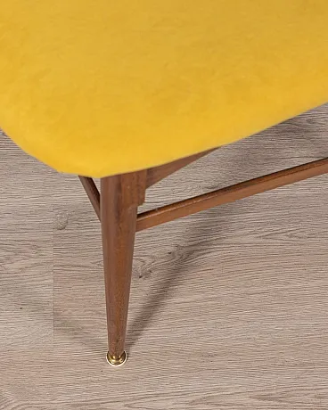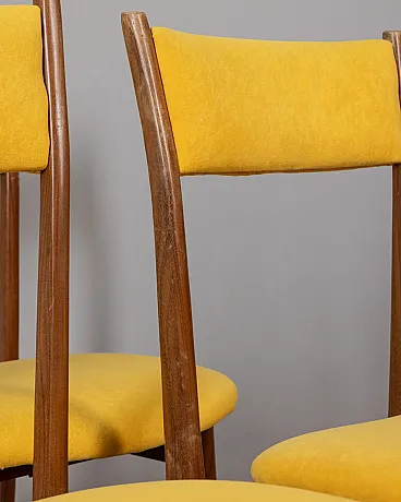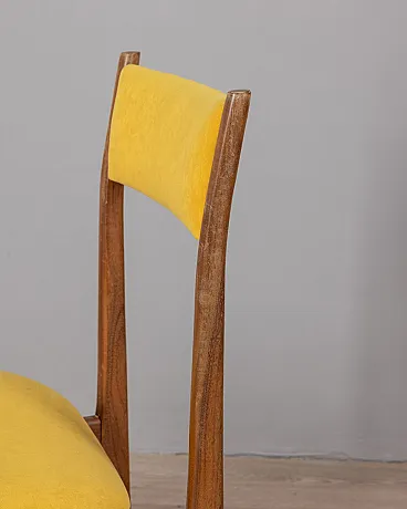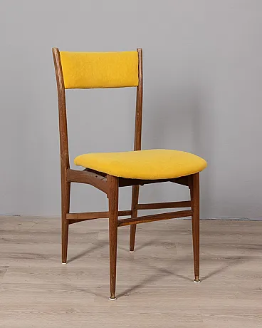 Set of four chairs with wooden structure and golden brass feet, yellow fabric upholstery, Italian design, 1960s.