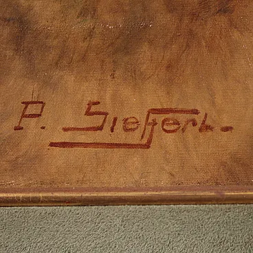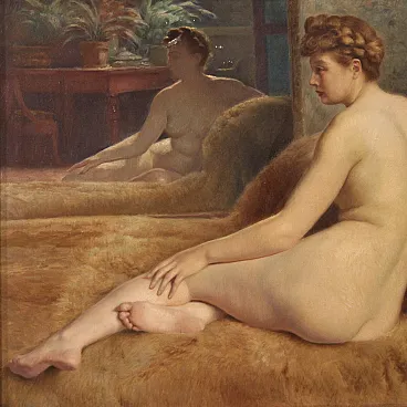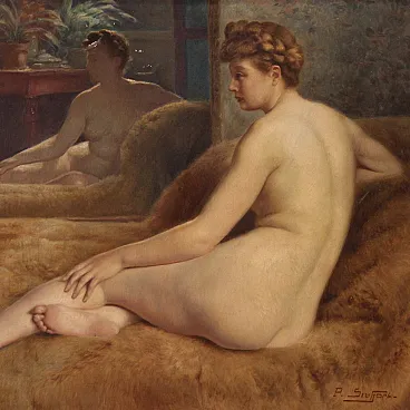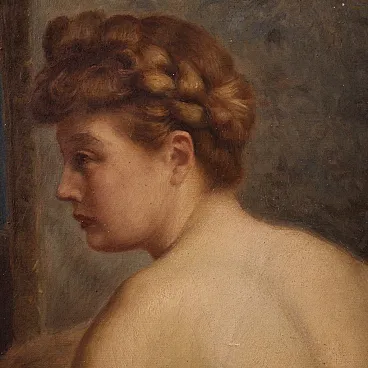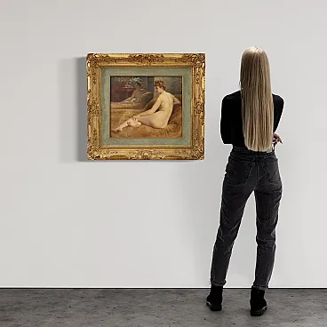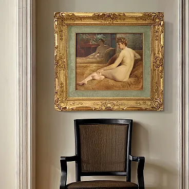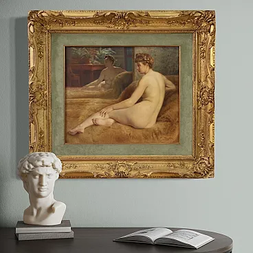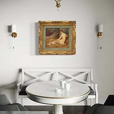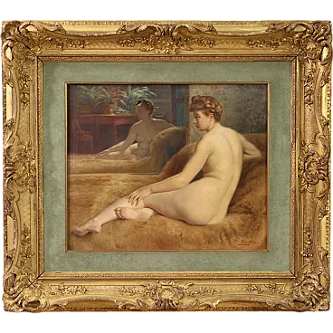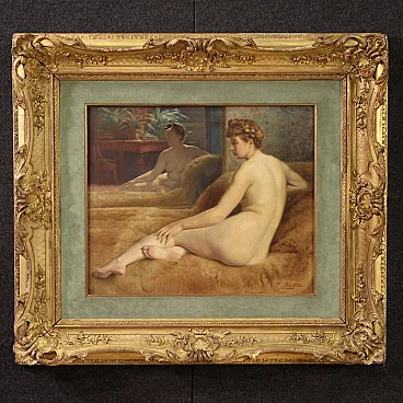 Beautiful female naked of the first half of the twentieth century. Oil work on canvas, in the first canvas, signed P. Sieffert, referable to the French painter Paul Sieffert (the work is currently not accompanied by Expertise, but it is possible to obtain it upon payment of the related additional costs). Known precisely for his nudes and portraits he exhibited at the Salon in Paris and also won the prestigious Grand Prix de Rome. The protagonist of the composition is a young woman sitting on a rich fur coat. The woman is caught in a classic and relaxed pose, with her face shot in profile and an absorbed gaze, while the reflection of the mirror adds an interesting game of perspective and depth to the scene. The executive quality is then indisputable, in particular the rendering of the embankment with admirable light effects on the skin is to be underlined. Coeva of the twentieth century in richly carved and golden wood, with some signs of time. The canvas has small color falls (see photo), overall in good conservative state. Painted light H 44.5 x L 53.5 cm.
