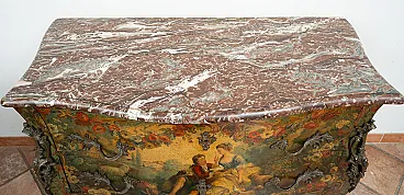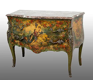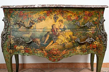 The front has two drawers bearing a central medallion with a romantic scene in the center and are removable via rocailles handles in golden bronze and chiseled.