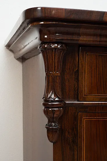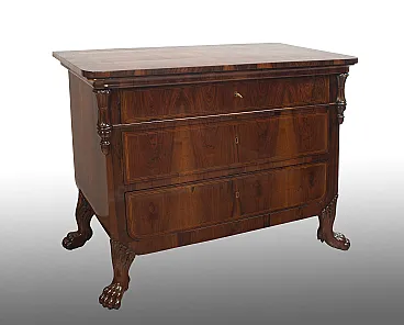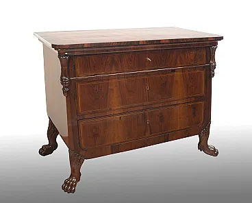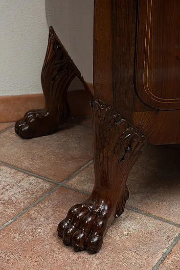 The main prospectus is designed by three large drawers arranged on three tracks of which the highest is slightly less capacious, all marked by a double and thin round of maple fillet. Climbing harsh ups and downs with relief and endings in Protome Ferina on all four feet, stylistic connotations that allow us to ascribe the furniture to the abanisterial of the first empire in Lucca.