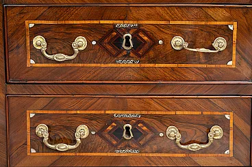 The front is characterized by two drawers highlighted by a beautiful mass on the woods with a geometric motive with a bronze profile in the center.