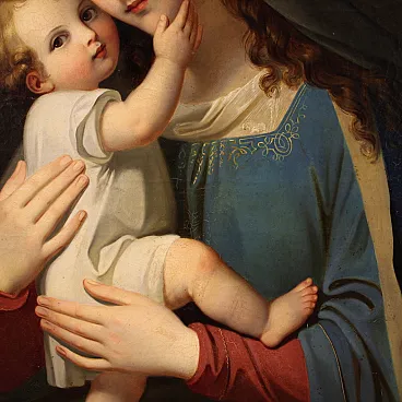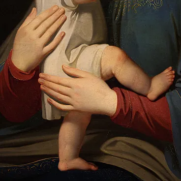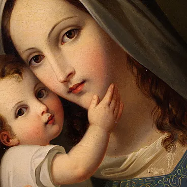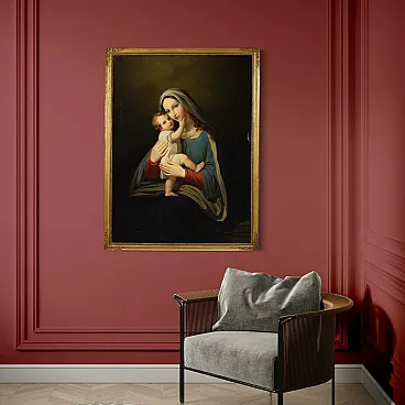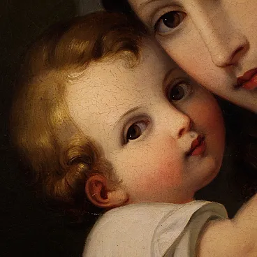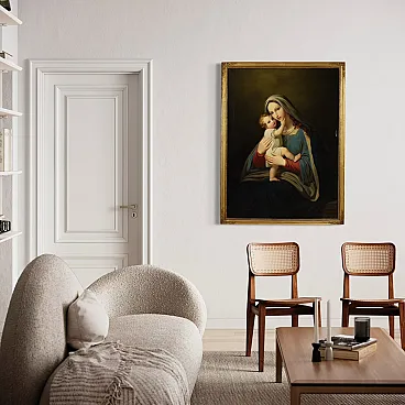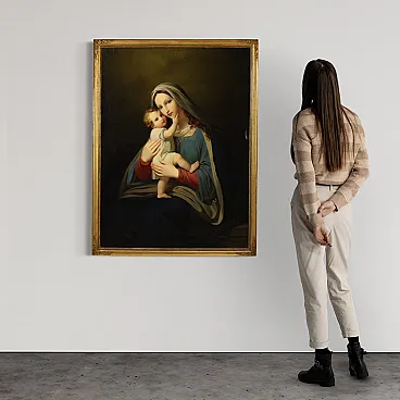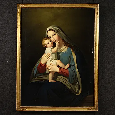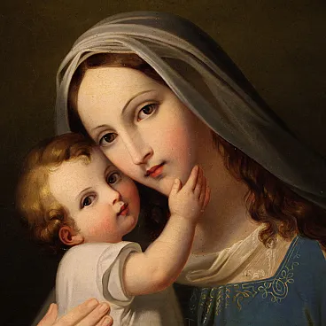 Ancient Swiss painting dated 1852. Oil work on canvas, in the first canvas, depicting the subject of sacred art, Madonna and Child of excellent pictorial hand. Picture of great extent and impact, characterized by warm shades and bright colors. The work that has recently been cleaned, bringing the color, sweetness of the faces and the delicacy of the hands of Mary and the little Jesus to the ancient splendor. Painted and dated in the bottom right M. Paul Deschwanden (see photo) referable to the Swiss painter Melchior Paul von Deschwanden (1811-1881), missing authentic. It works easily attributable to the famous painter given the pictorial quality, to the loved person and the delicacy of setting, unfortunately missing additional documentation. Original frame, finely carved coeval frame and golden decoration (see photo). It operates in beautiful patina for antique dealers and collectors of nineteenth century. Painted with some very small sign of time, overall in good conservative state. Painted light H 123 x L 92 cm.