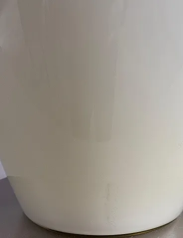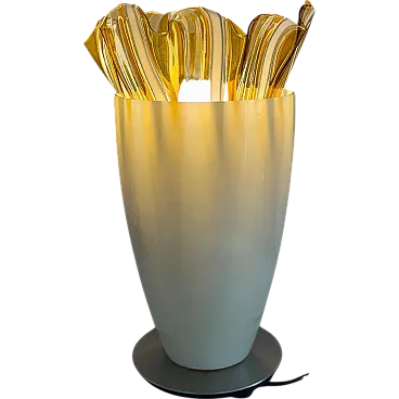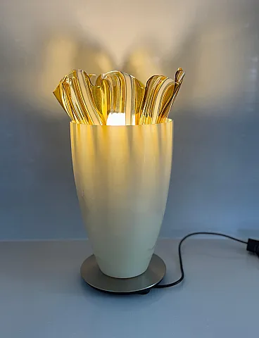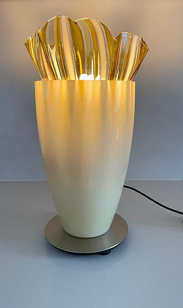 Particolare lampada da tavolo mod. Plissé firmata Venini, 2004 Nei toni del giallo, presenta controdiffusore in vetro a canne policrome che ricorda il famoso "fazzoletto" di Venini; diffusore in vetro incamiciato e base in metallo satinato. Firma e data sul fianco del paralume