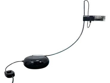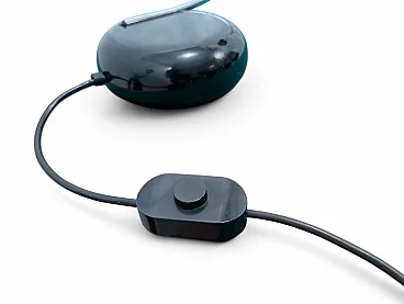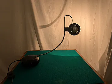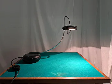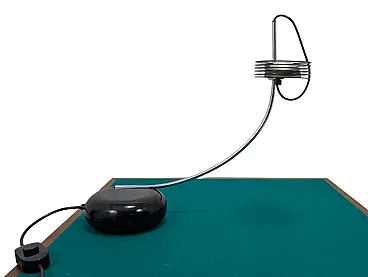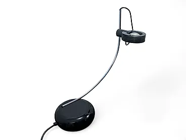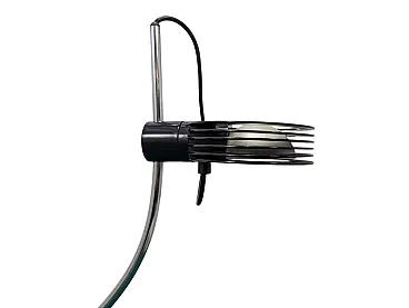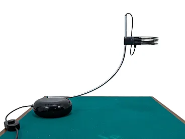It is made with heavy metal base, chromed neck and adjustable lampshade. It was designed by Bruno Gecchelin and the model is called Wing.
