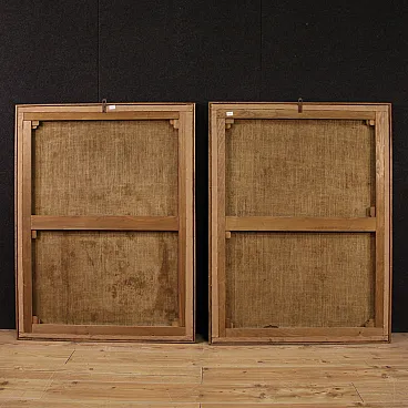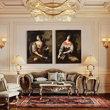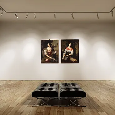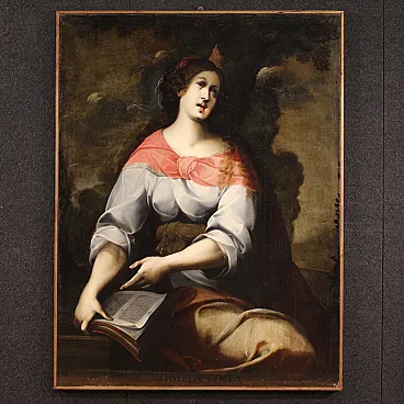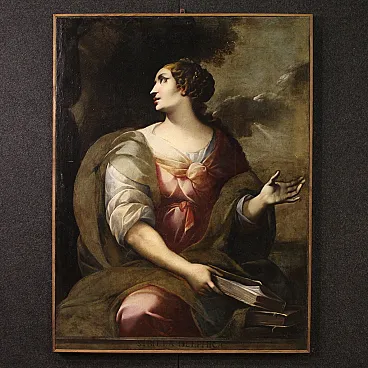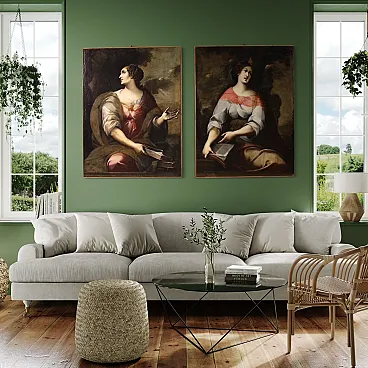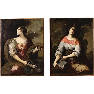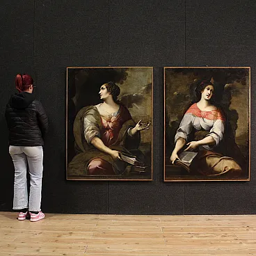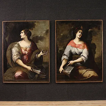 Rare pair of Italian paintings from the second half of the seventeenth century. Oil works on canvas depicting two splendid female figures recognizable thanks to the inscriptions below (see photo), the Sibyl delic, linked to the oracle of Apollo in Delphi and the Cumana Sibyl, prophetess of the Campania area. Both are presented by bust with an open book on the womb, an iconographic attribute typical of the sibyls and symbol of their prophetic role. The pose is graceful and the incarnate pearly, while the gaze turns in opposite directions, one contemplative and the other inspired. Paintings of remarkable pictorial quality, in particular the surrender of the drapery must be underlined, divided into large backgrounds of color and full of transparencies. The use of dark funds, even if opened by glimpses of landscape light, make the figures even more alive and the chromatic palette more heated. The paintings have two small wooden chopsticks, with some signs of time. Paintings already restored with Rintelo, replacement of the frame and color recovery in small points. Overall in good conservative state. (The two works are currently not accompanied by Expertise, but it is possible to obtain it upon payment of the related additional costs). Light paintings H 131.5 x L 99.5 cm.