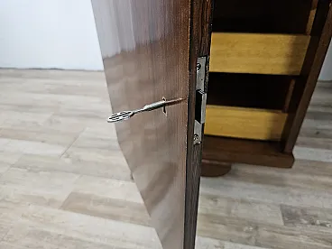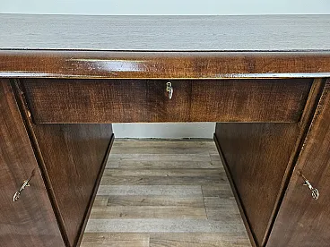 Elegant of the 1930s desk of the Art Decò with oak wood structure, enriched by two side doors and a central drawer. On the left we find three large and robust drawers, on the right side two internal shelves. In the center there is a drawer. All locks are functional and accompanied by original keys of the time. Polidable shellac furniture, presents normal wear signs due by age and use.
