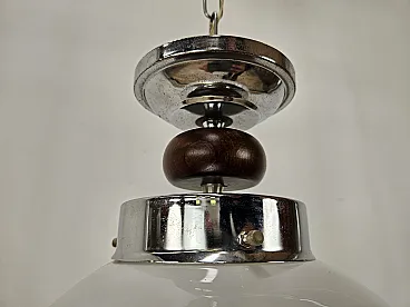 60s chandelier with metal structure decorated with a wooden ring and murano glass corn. Vintage lamp attributable by design to Mazzega. Normal wear signs, perfect glass.