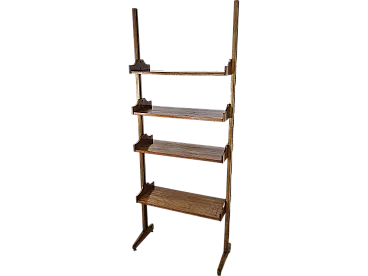 70's modular library or shelving in walnut with four solid shelves and feet adjustable in height. It is possible to move the shelves as desired thanks to the special brass screws. Modern and always functional furnishing element, it lends itself very well to every type of environment given the lightness in the line and the compactness of the measures. Polished and clean, presents normal signs due by age and use. Not all brass pins are present as shown in the photo, but still the shelves are all stable and sales.