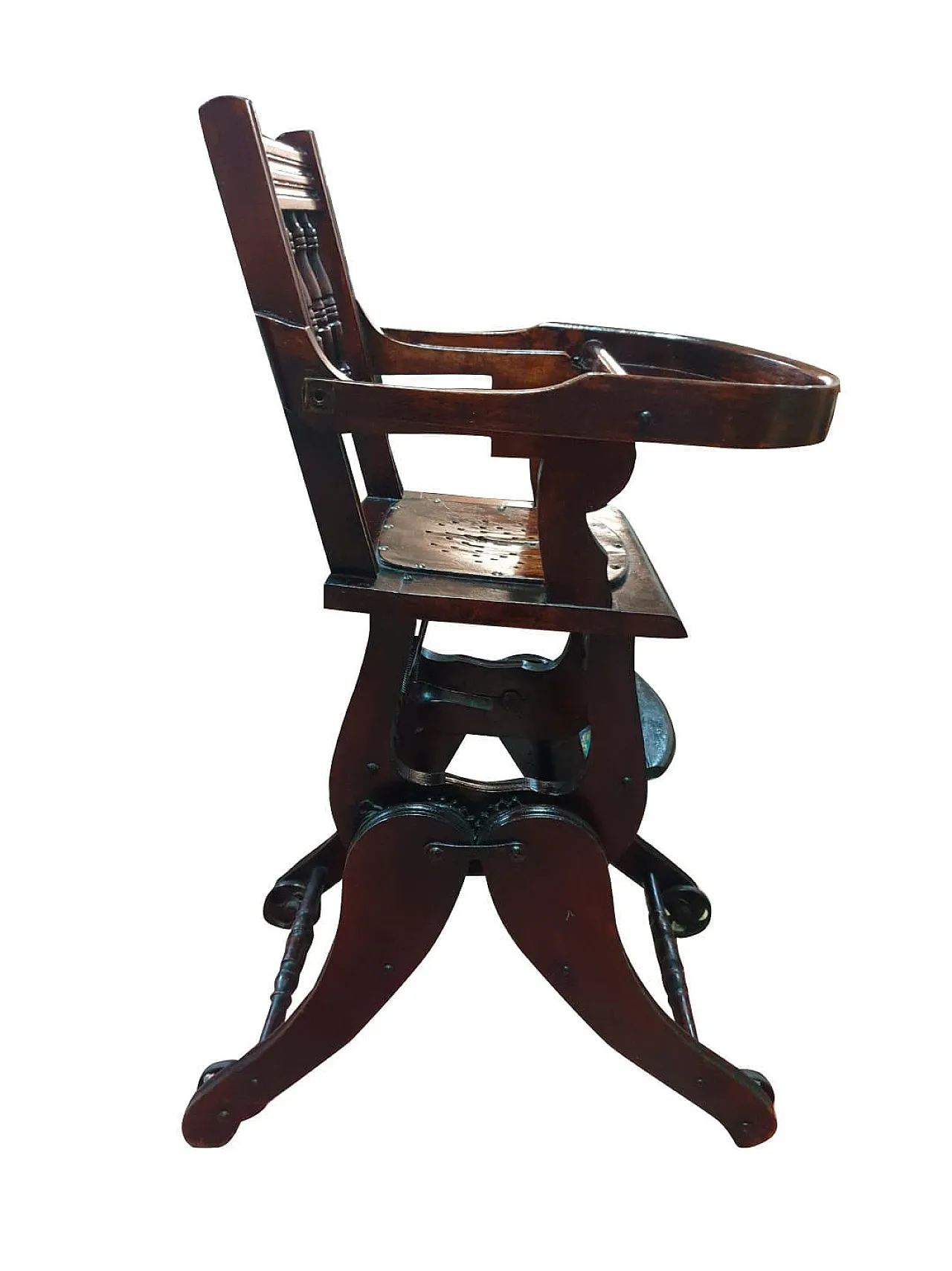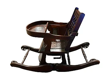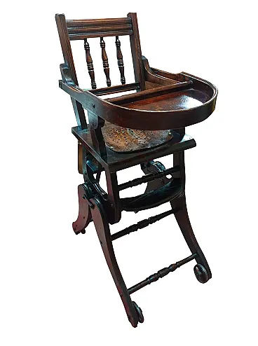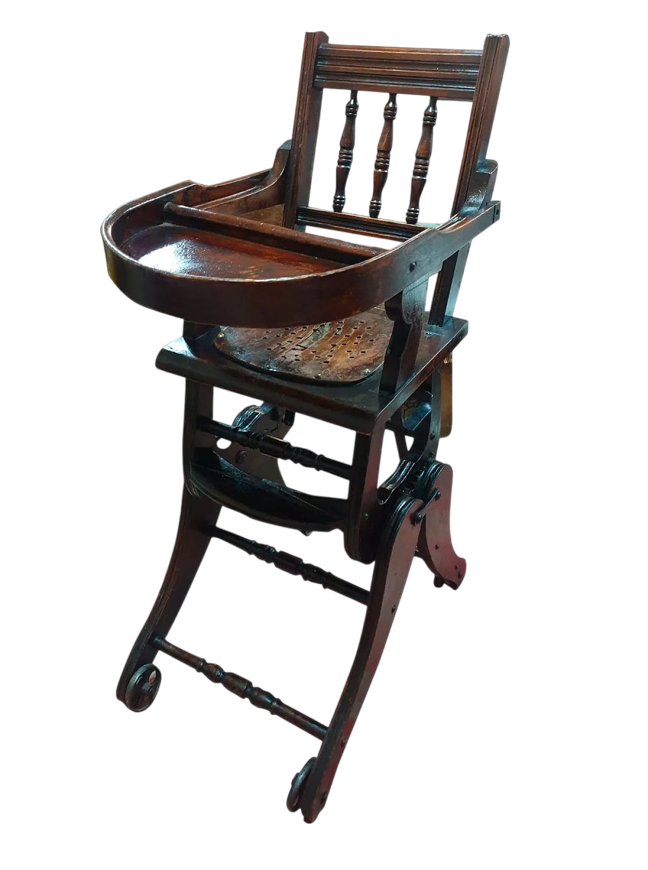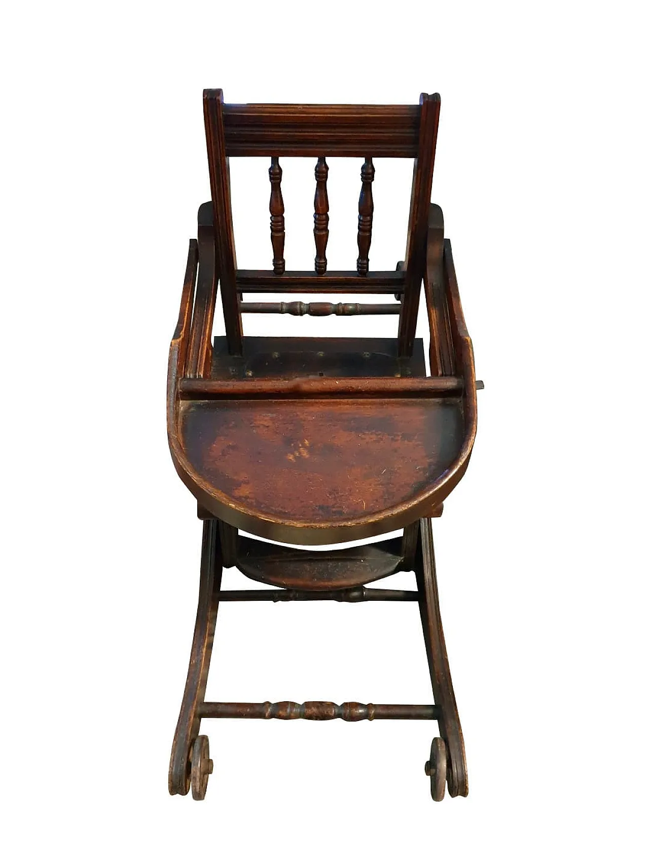 Raro ed elegante seggiolone inglese da bambino del periodo Vittoriano, databile tra il 1880 e il 1900, interamente realizzato in faggio tornito. Grazie a un ingegnoso sistema meccanico in ferro, questo oggetto si trasforma da seggiolone a carrello con tavolino, o in alternativa in sedia a dondolo o girello, unendo funzionalità e fascino d’altri tempi. Il legno presenta una bellissima patina originale e si conserva in ottimo stato strutturale, privo di tarli o rotture. Un oggetto da collezione raro, decorativo e perfettamente funzionante, ideale anche per vetrine, ambienti vintage o arredamenti eclettici.
